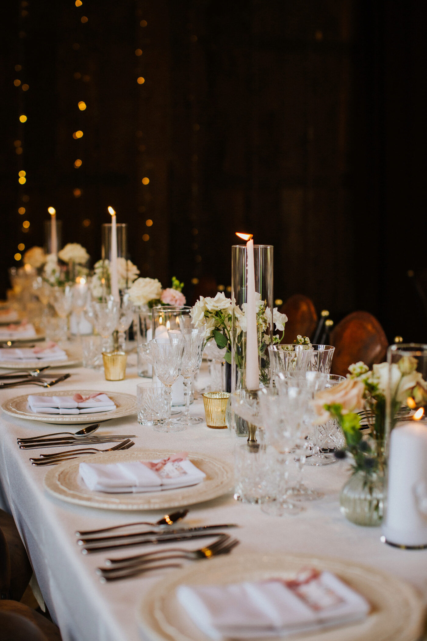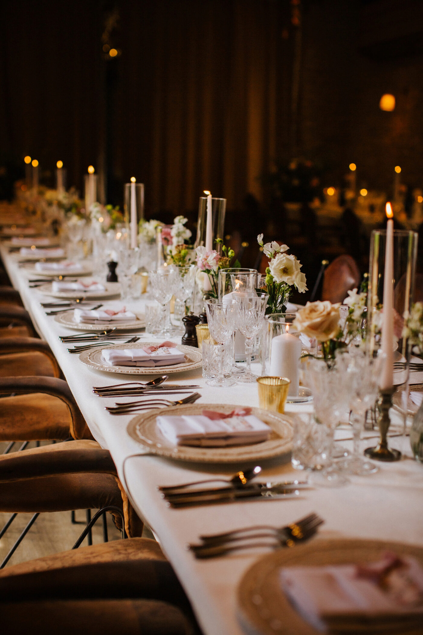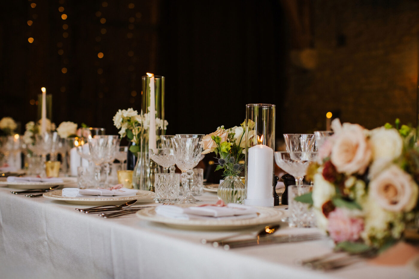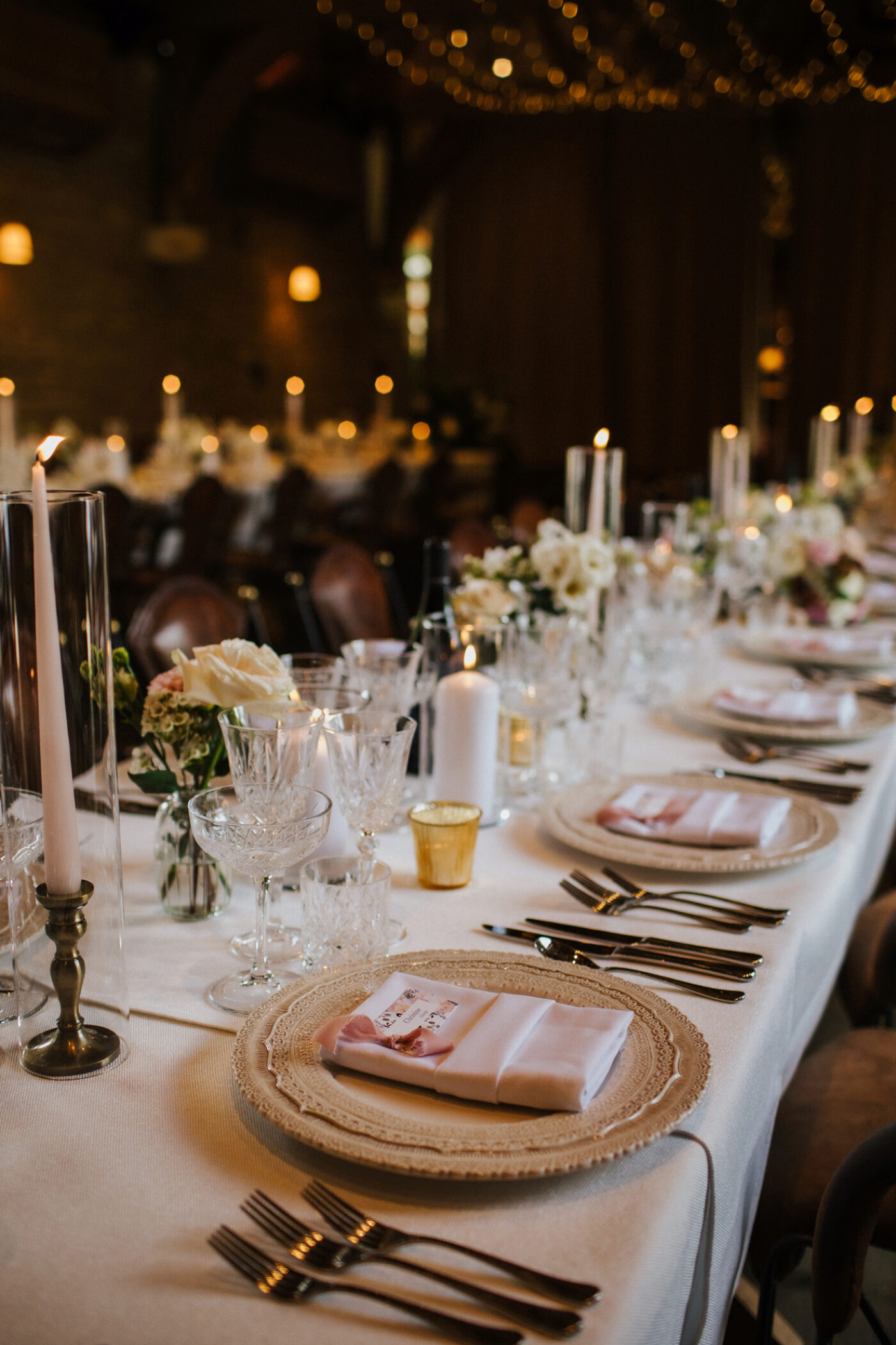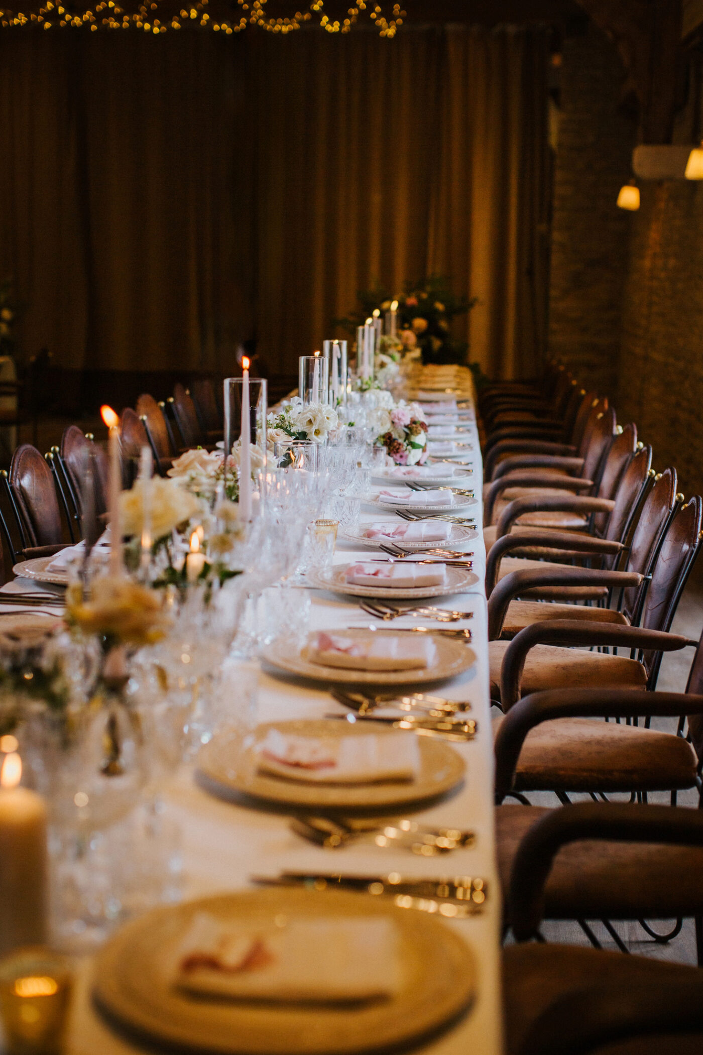 From the ceremony to the wedding breakfast, every moment was styled with understated grandeur — striking the perfect balance between polished elegance and the venue's rustic character. Lush floral arrangements in creamy whites, warm peach tones, and delicate neutrals added texture and depth, while tablescapes featured soft linens, golden accents, and a glow of candlelight for a warm, inviting atmosphere.