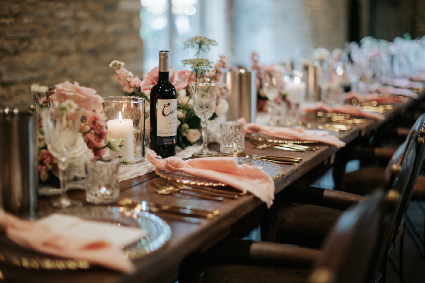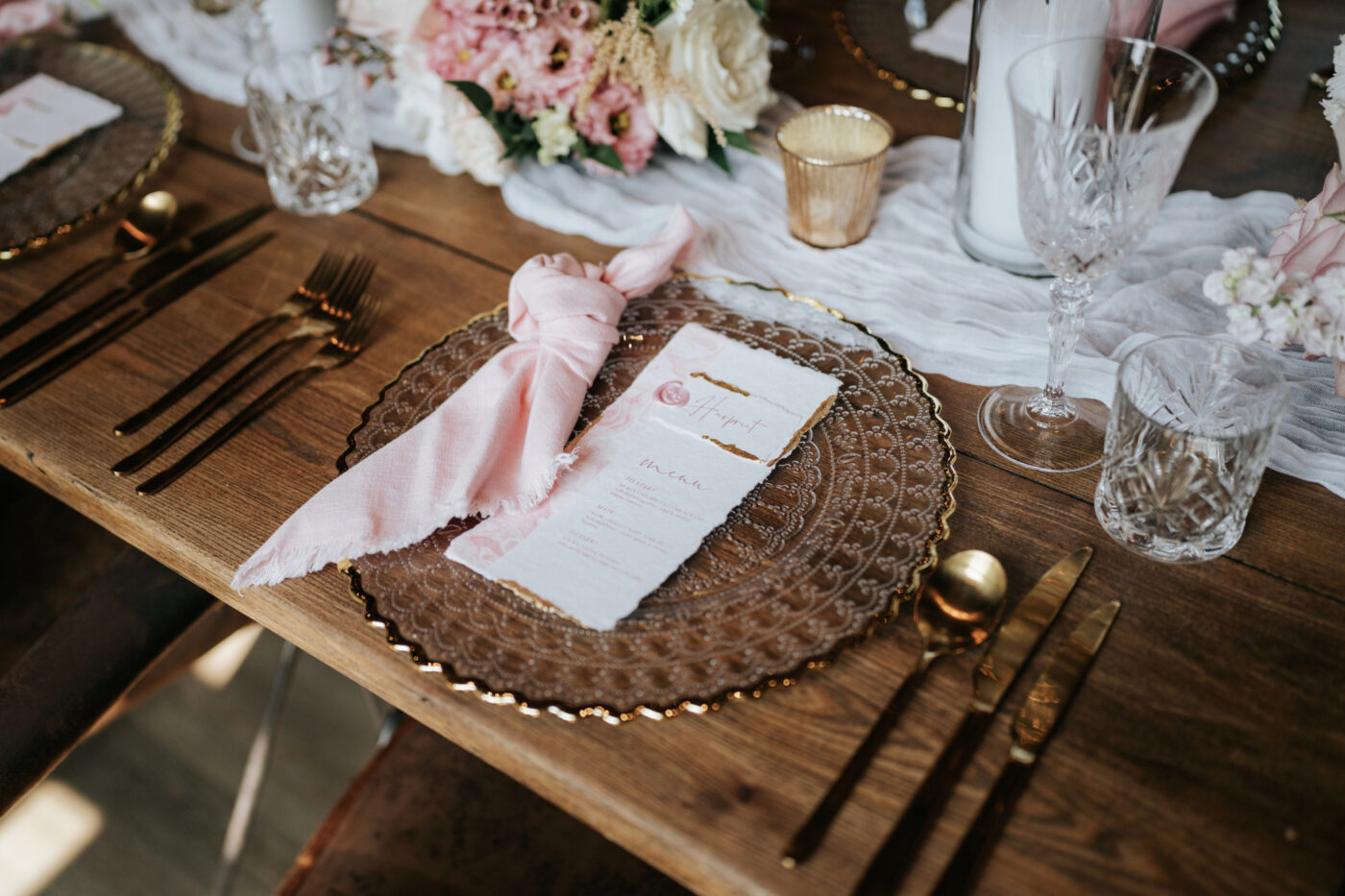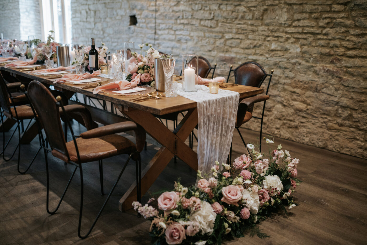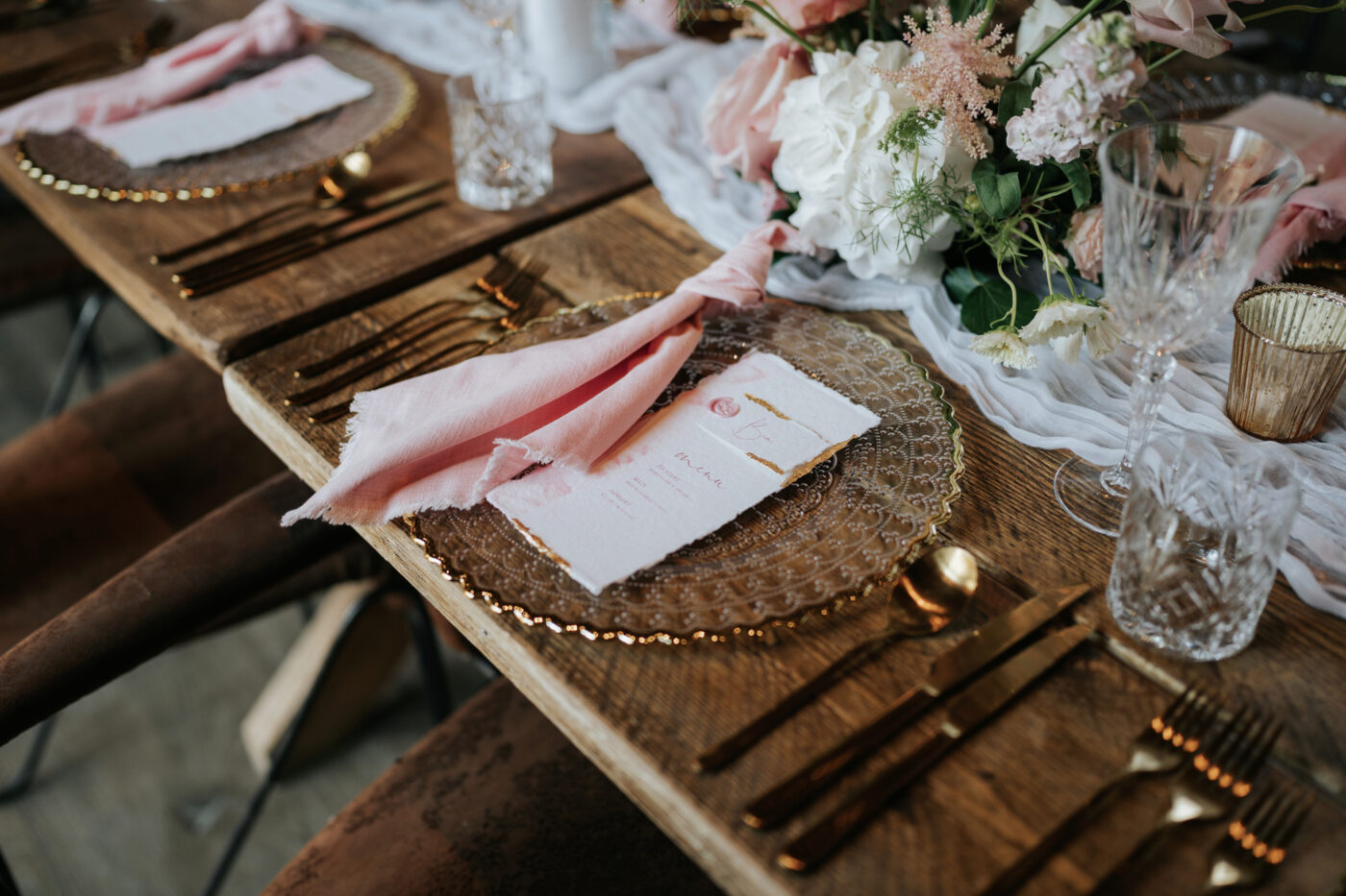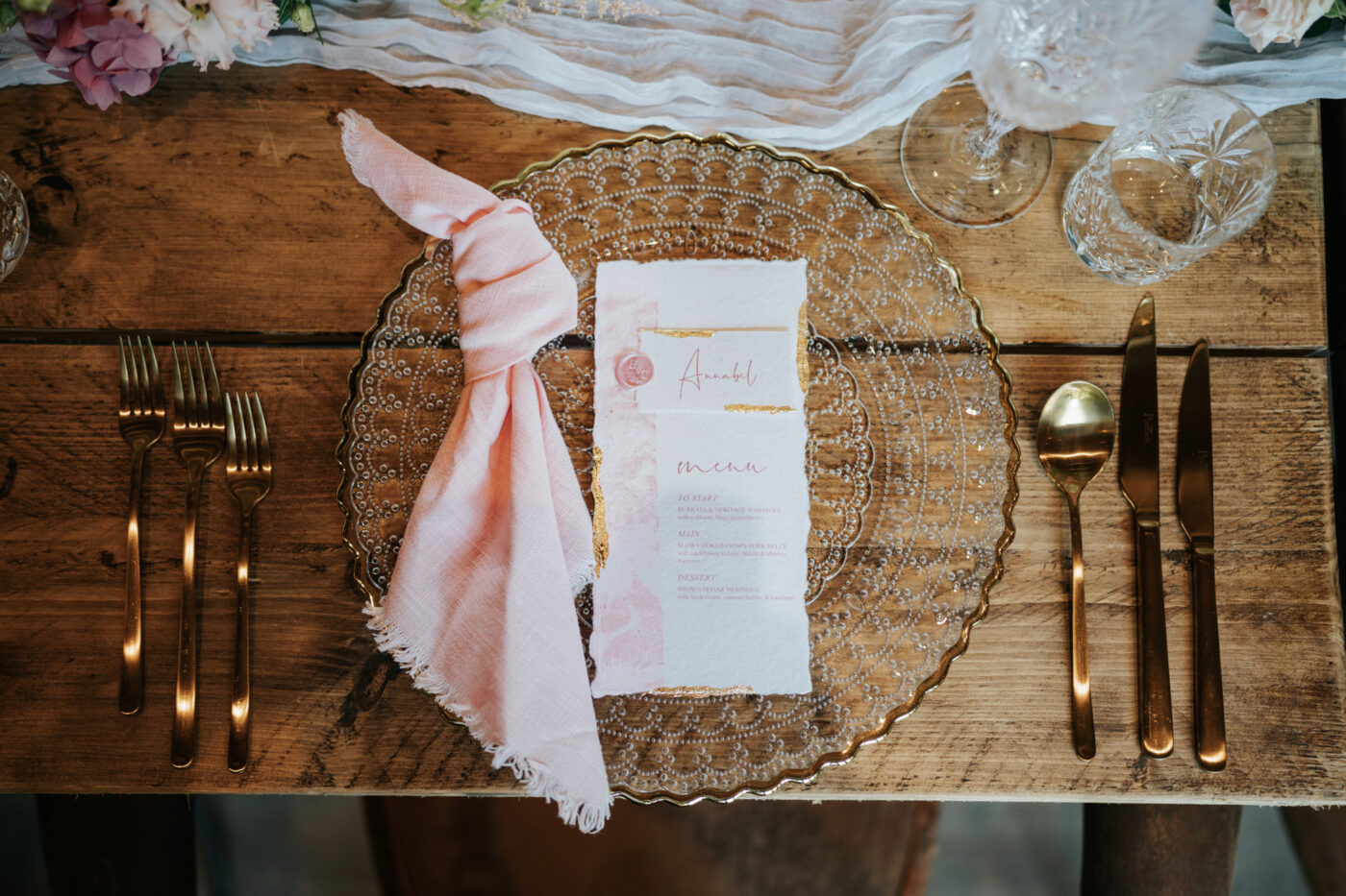 The styling unified the ceremony and wedding breakfast, dressing natural wooden tables with delicate fabrics, organic florals, and gold accents—striking a perfect balance between rustic and refined. Florals in pinks, blush and ivory enhanced the space with understated abundance.