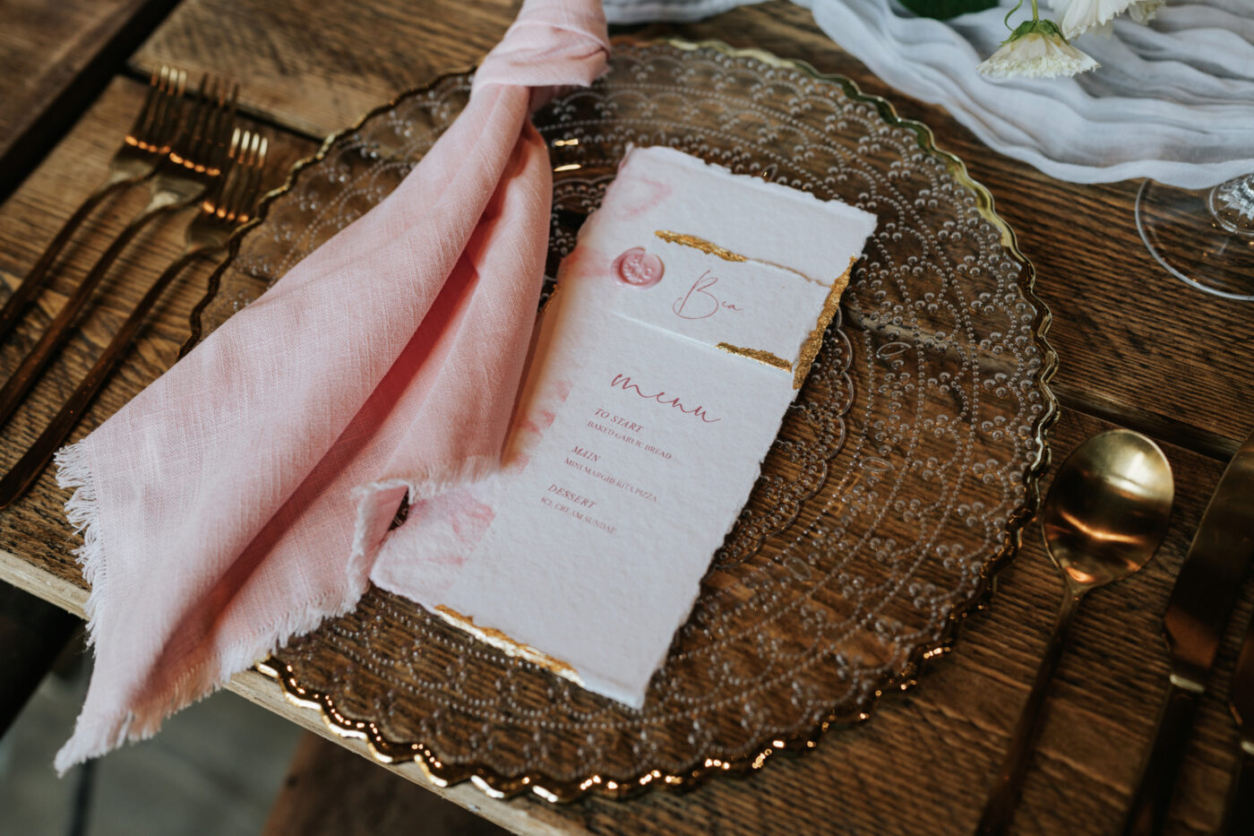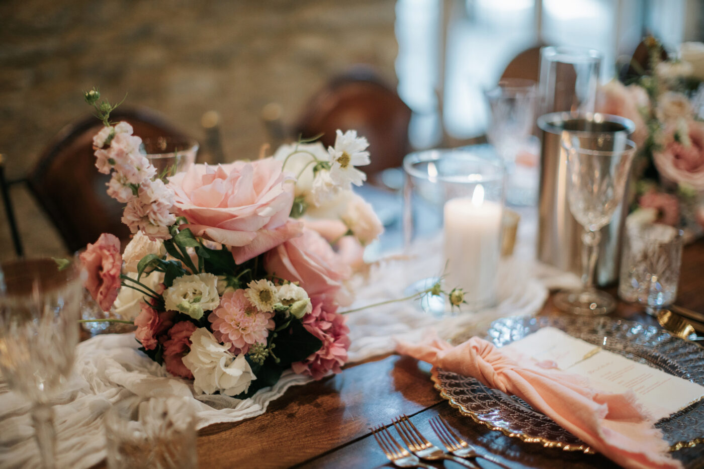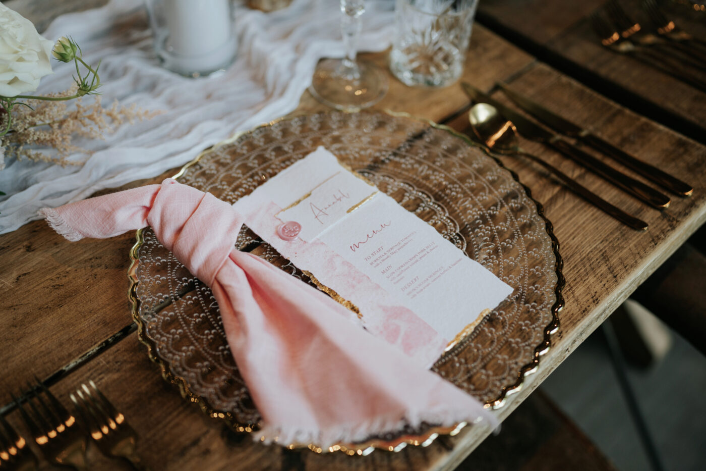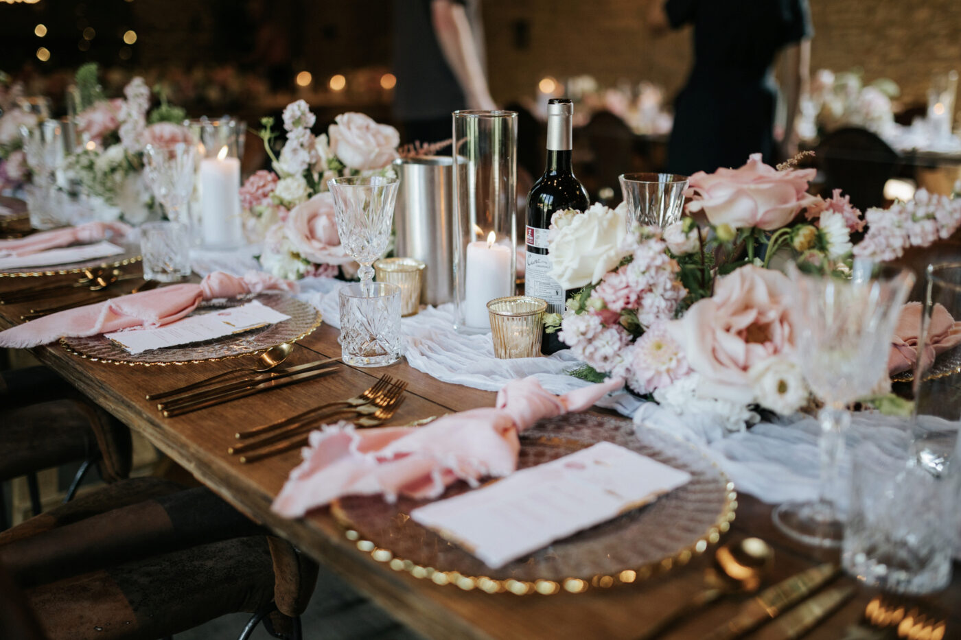 The styling unified the ceremony and wedding breakfast, dressing natural wooden tables with delicate fabrics, organic florals, and gold accents—striking a perfect balance between rustic and refined. Florals in pinks, blush and ivory enhanced the space with understated abundance.