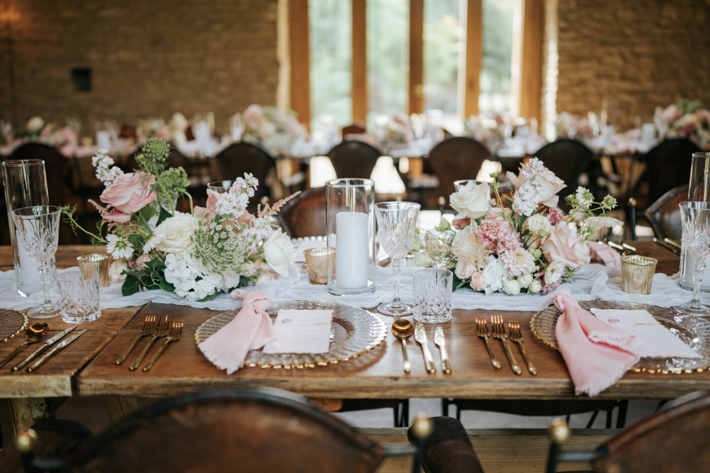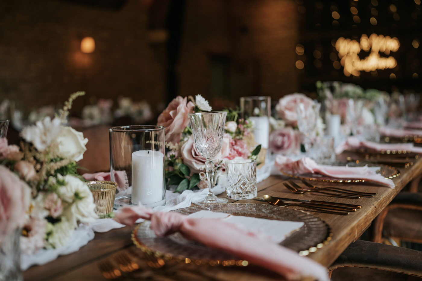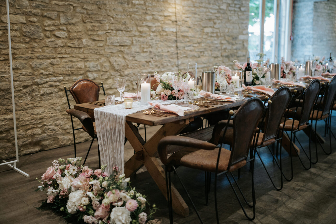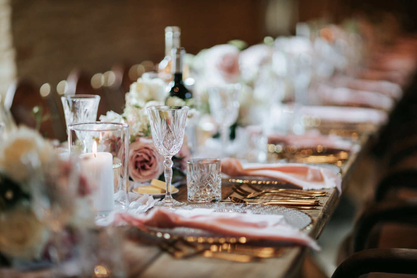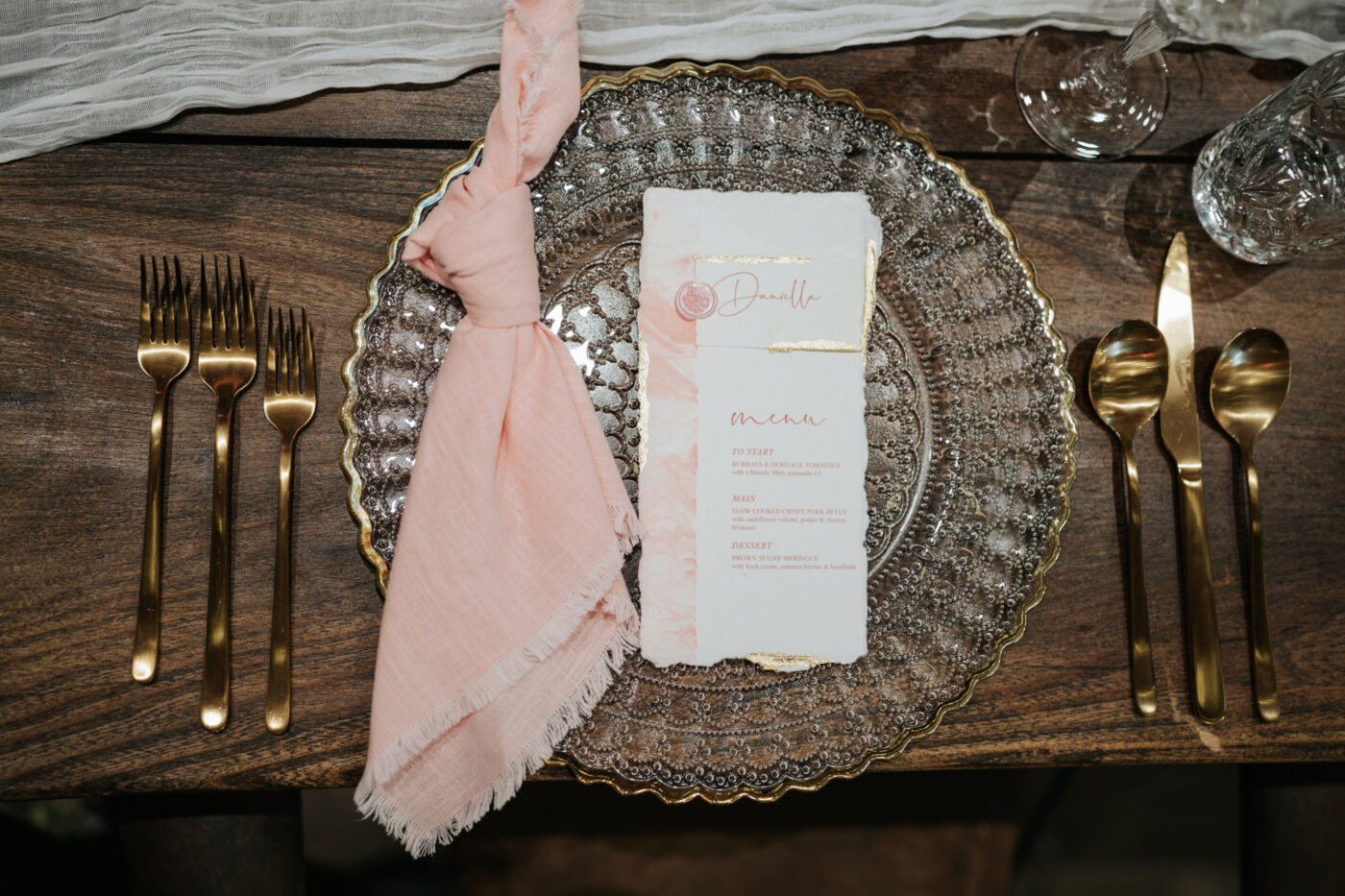 The styling unified the ceremony and wedding breakfast, dressing natural wooden tables with delicate fabrics, organic florals, and gold accents—striking a perfect balance between rustic and refined. Florals in pinks, blush and ivory enhanced the space with understated abundance.