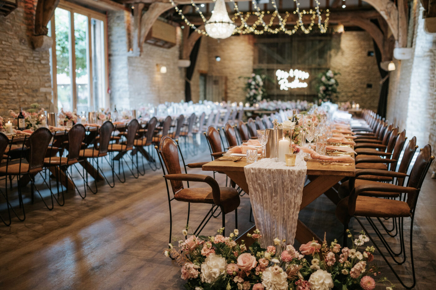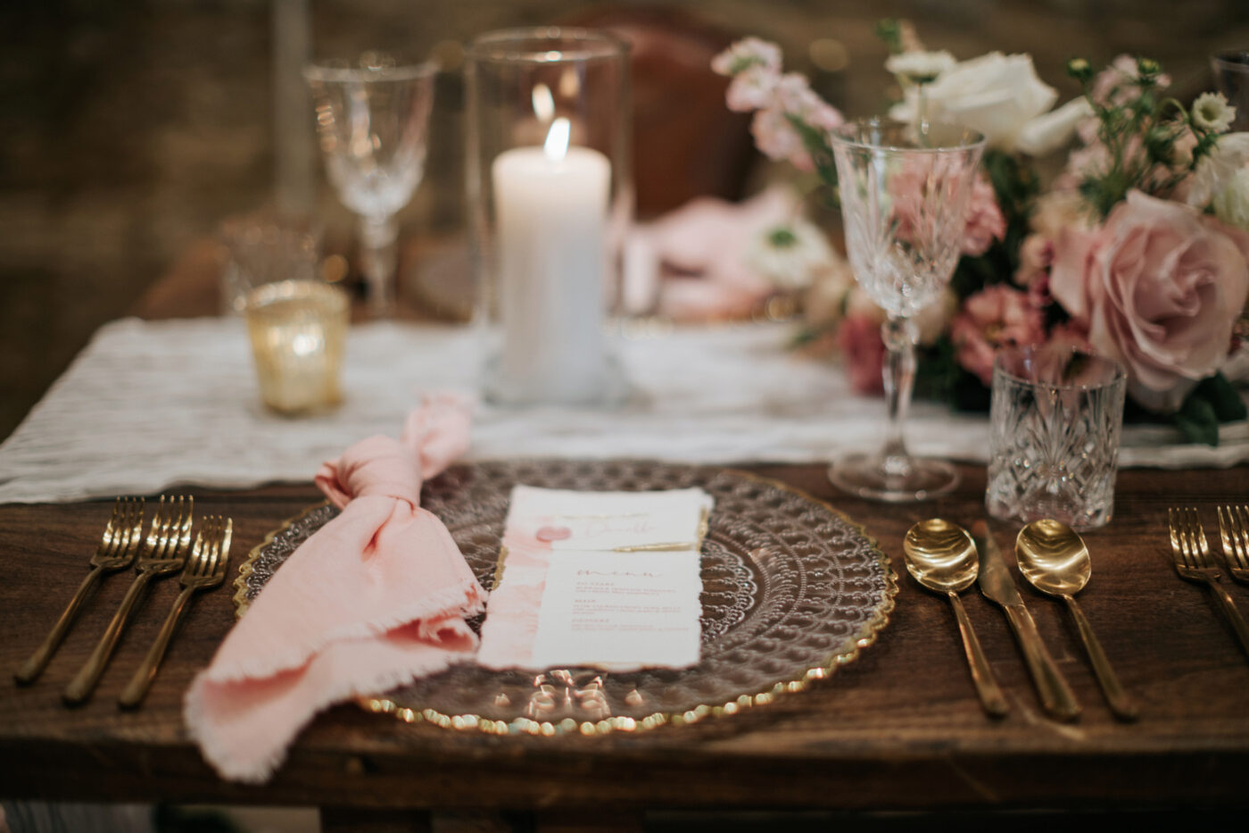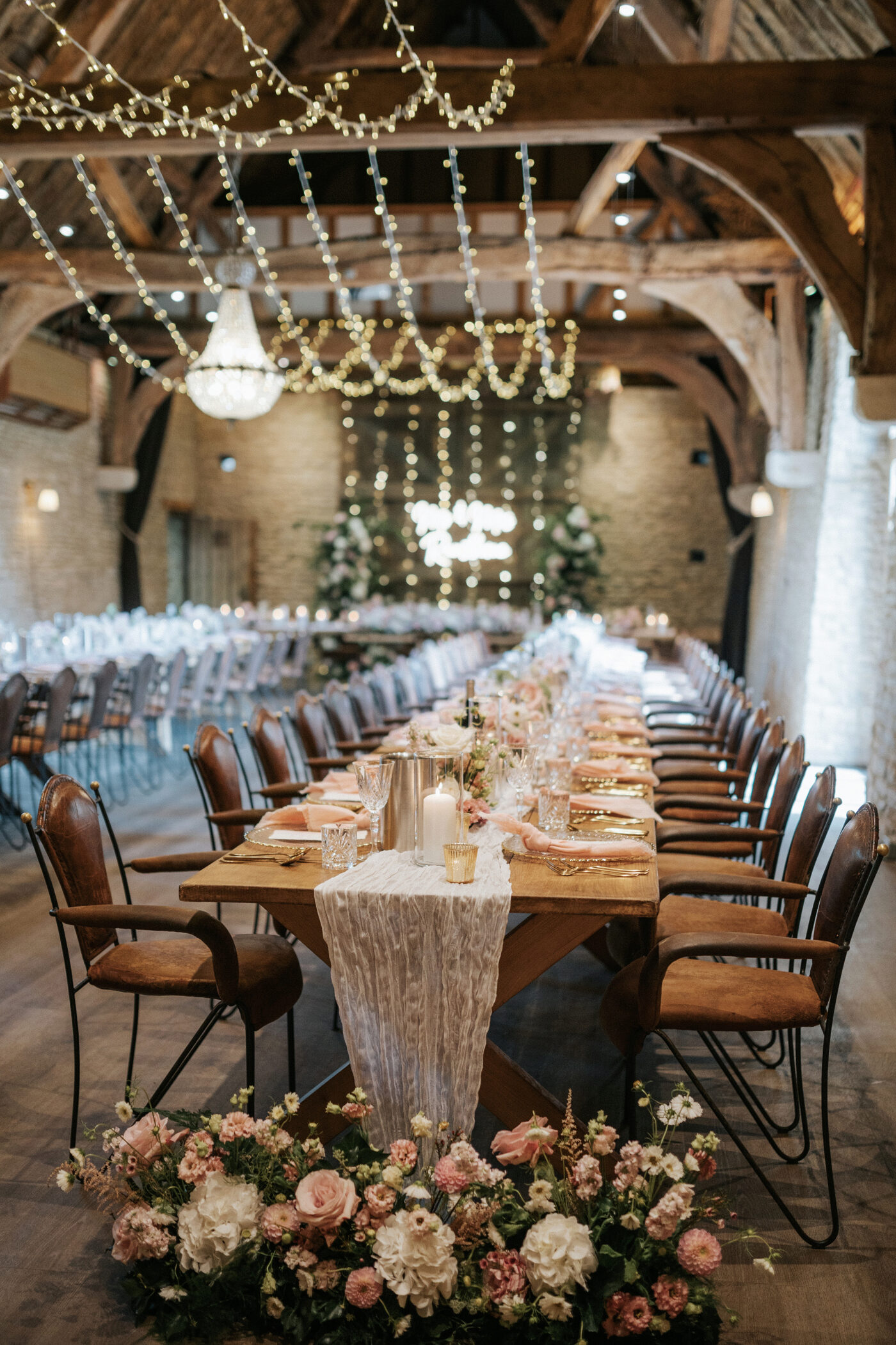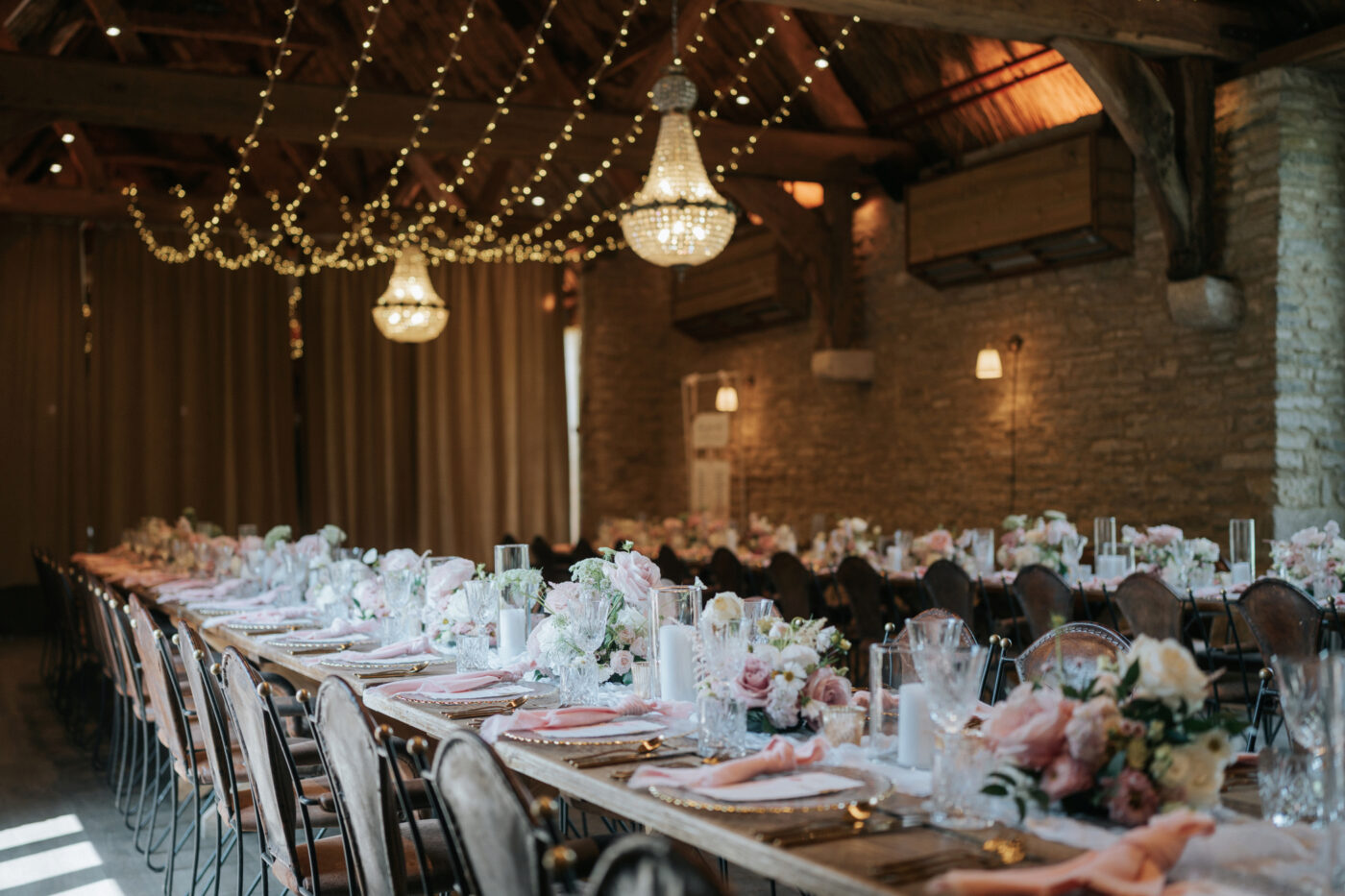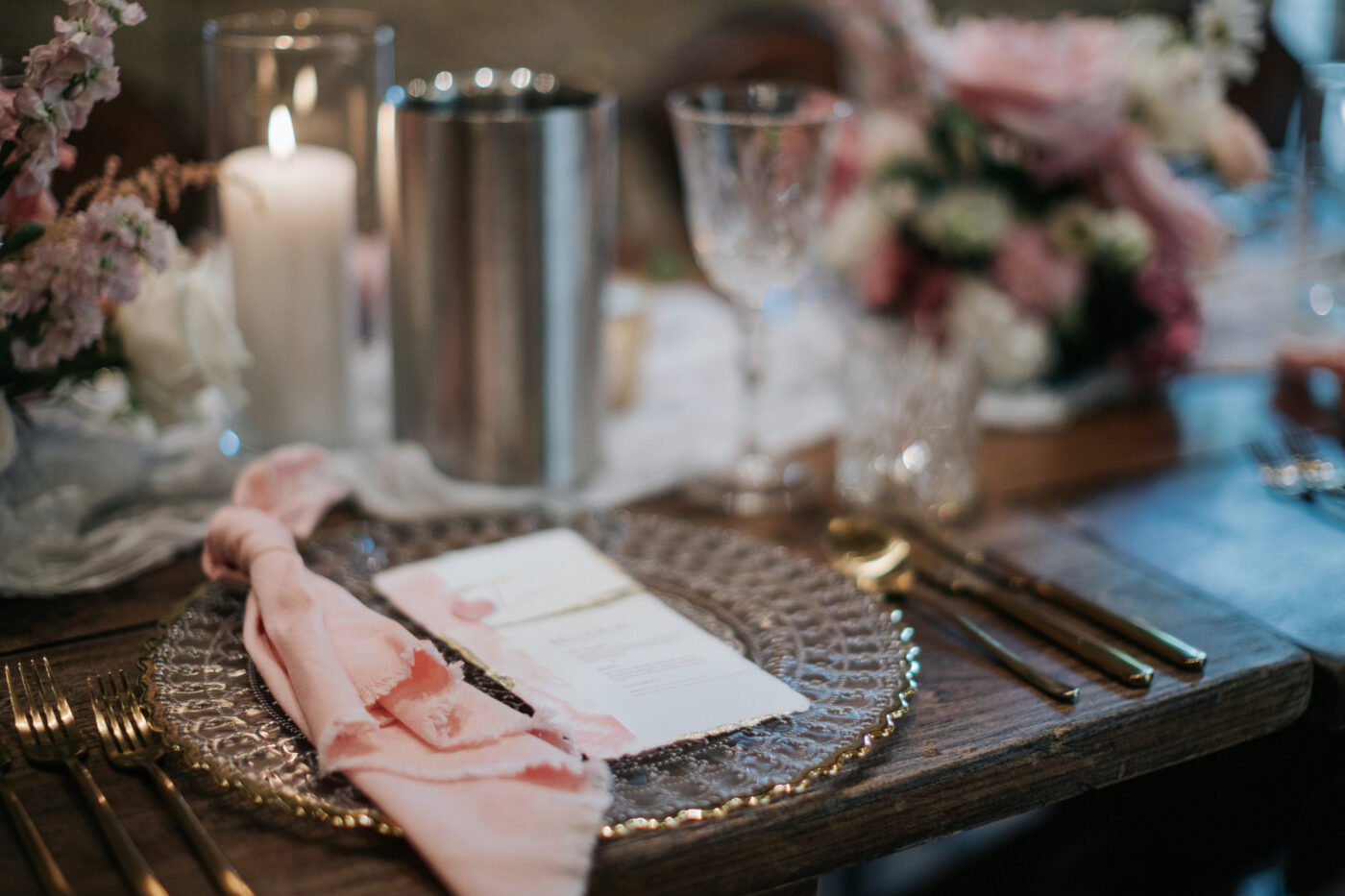The styling unified the ceremony and wedding breakfast, dressing natural wooden tables with delicate fabrics, organic florals, and gold accents—striking a perfect balance between rustic and refined. Florals in pinks, blush and ivory enhanced the space with understated abundance.