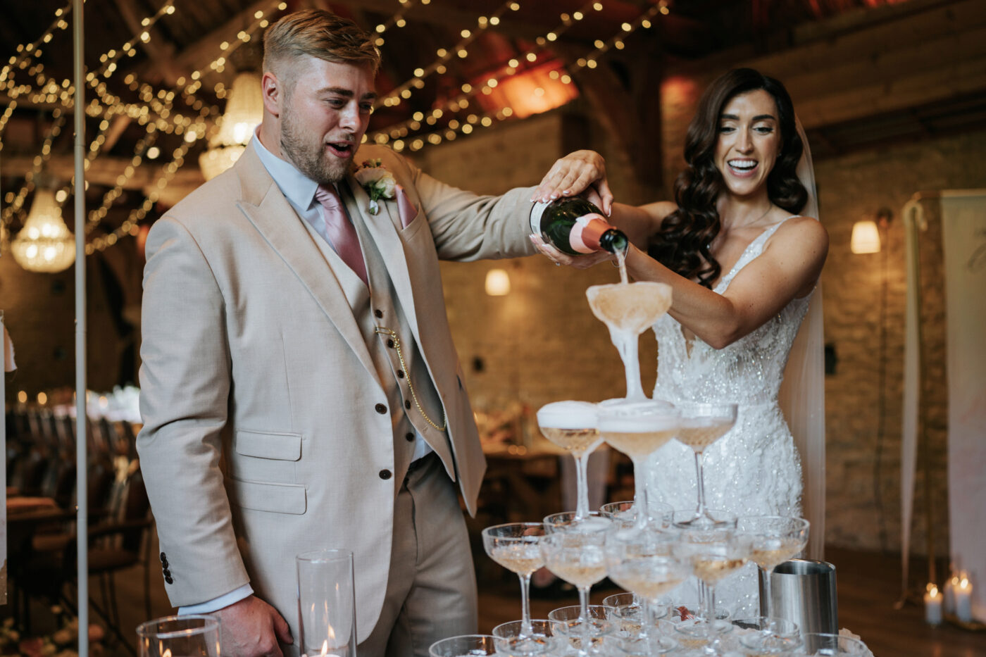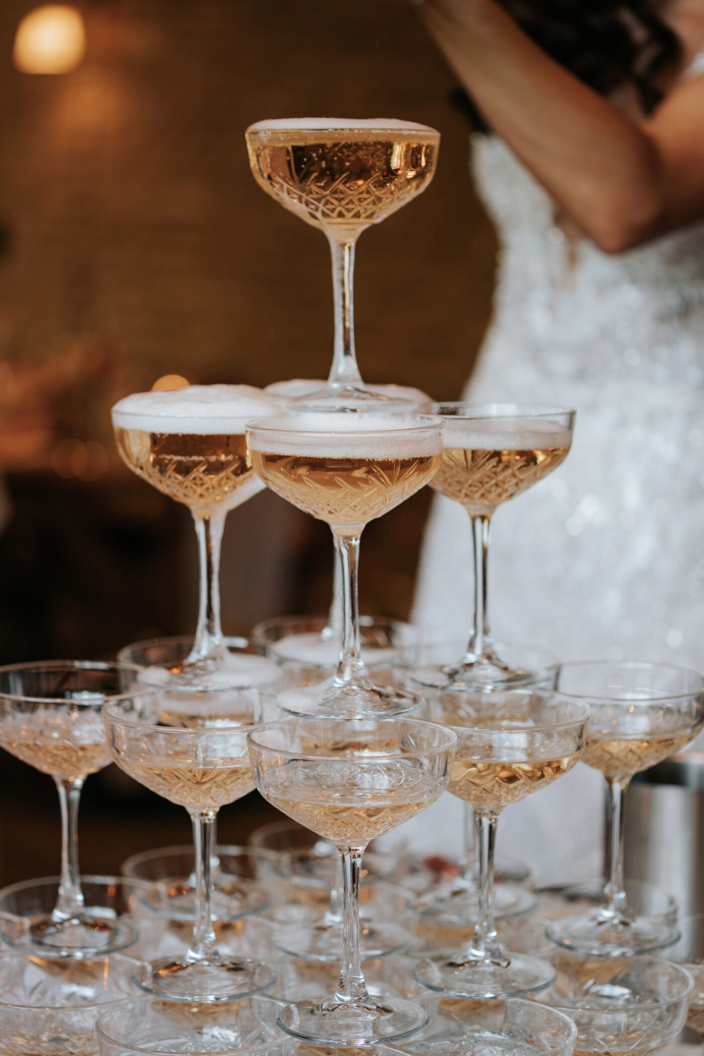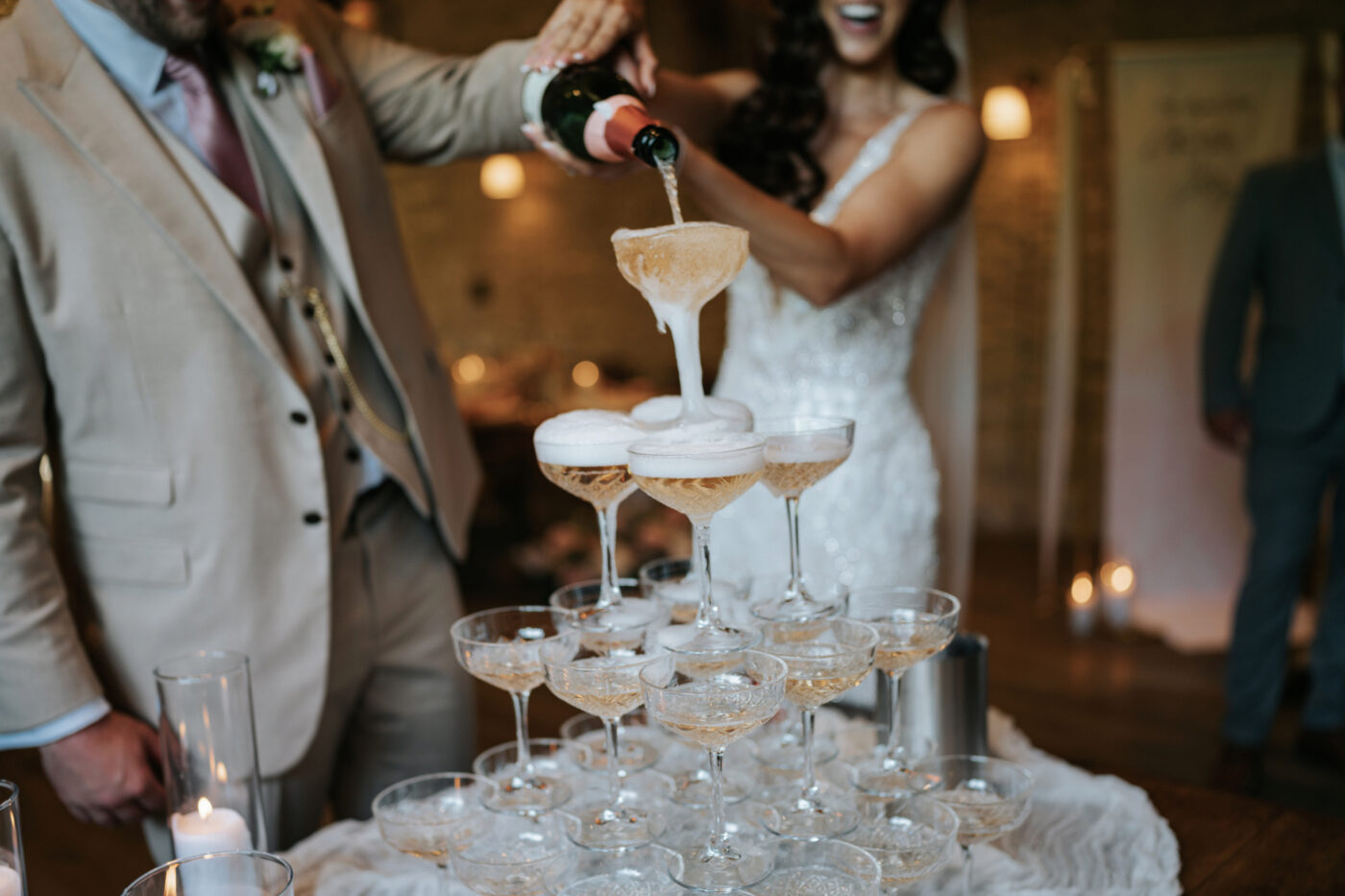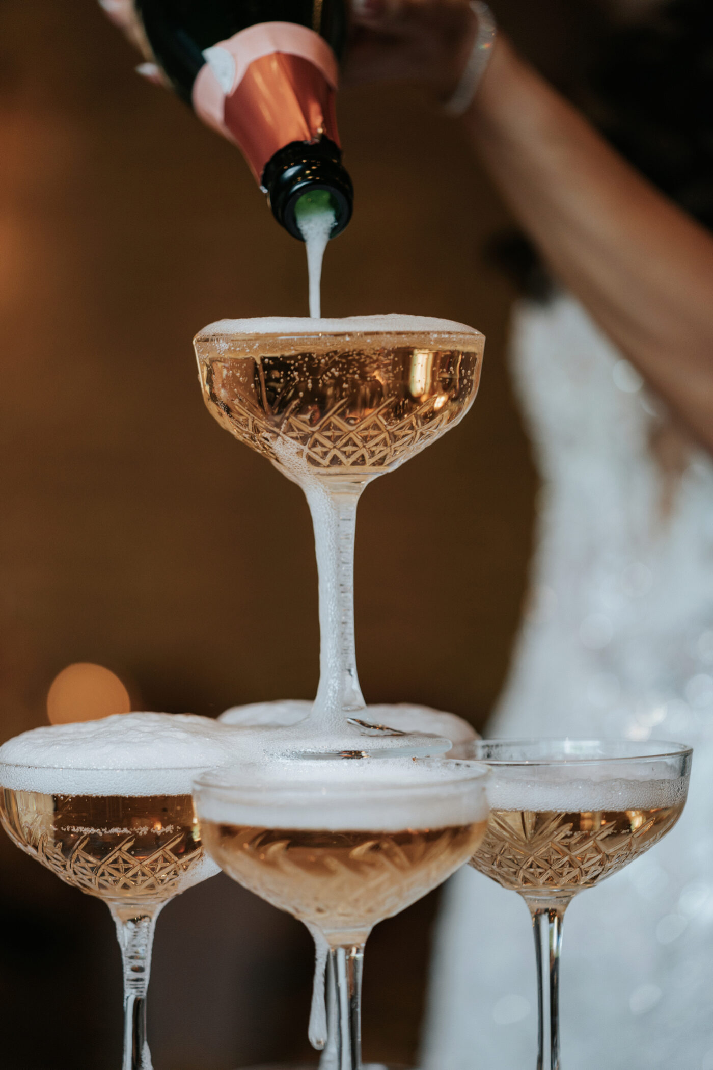 A champagne tower added a touch of celebratory glamour, perfectly complementing the warm ambient lighting of candles and golden highlights that created an intimate atmosphere from day into evening. Every element reflected dreamy romance and personal meaning, resulting in an effortlessly elegant, timeless celebration that truly honored Tythe's charm.
