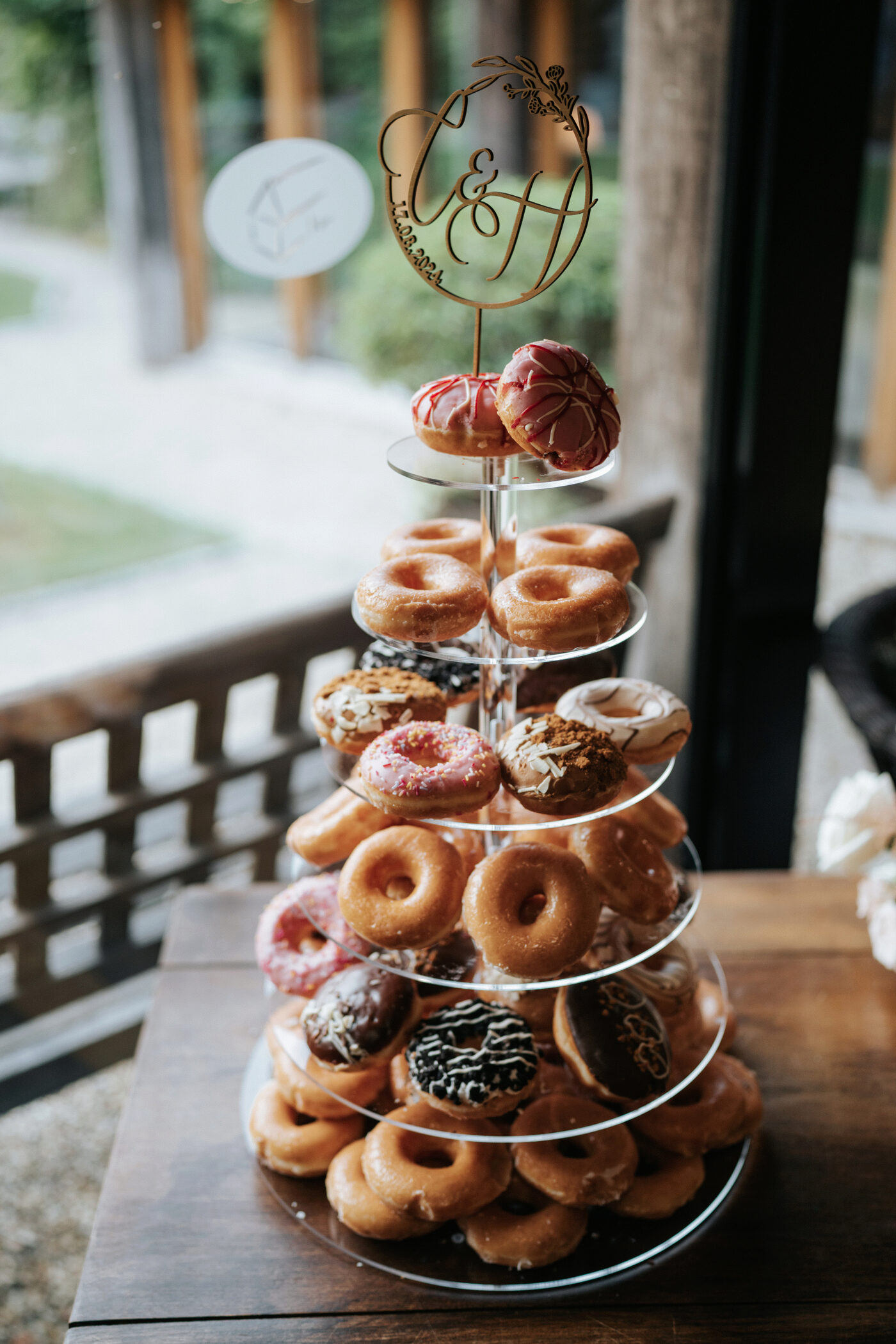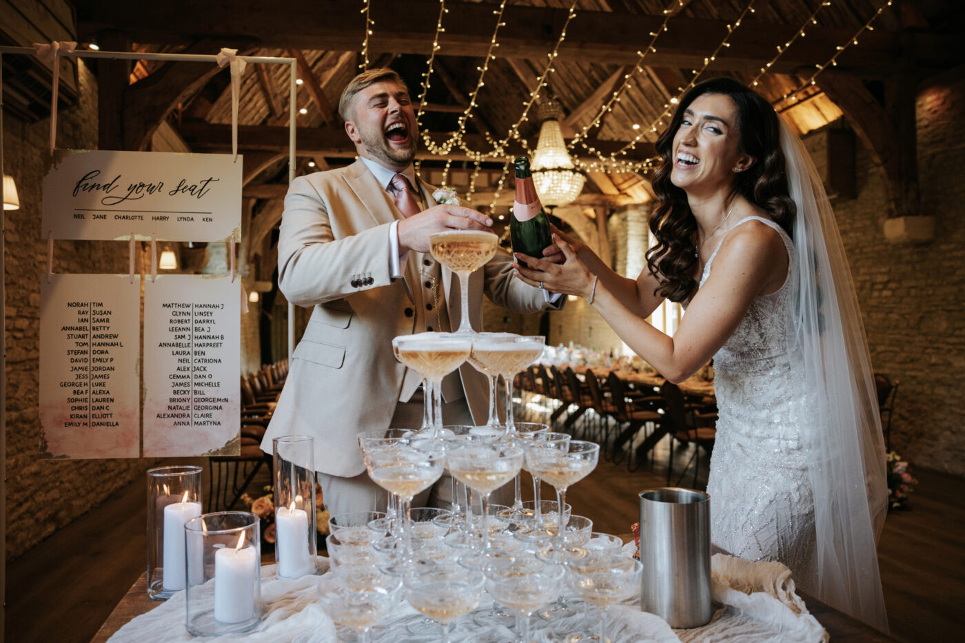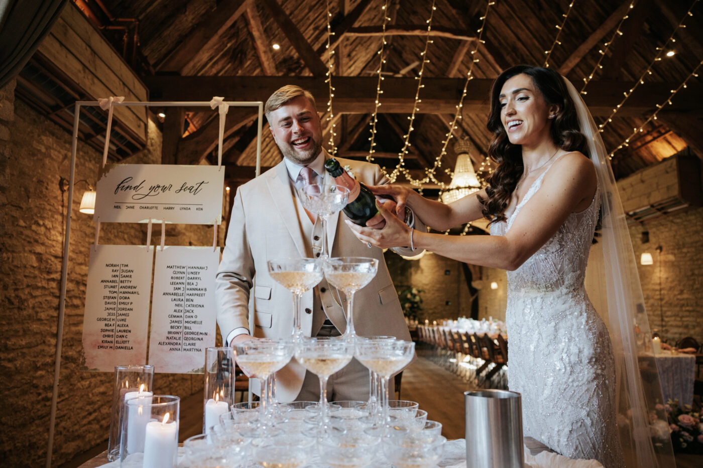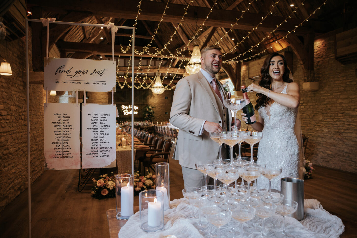A champagne tower added a touch of celebratory glamour, perfectly complementing the warm ambient lighting of candles and golden highlights that created an intimate atmosphere from day into evening. Every element reflected dreamy romance and personal meaning, resulting in an effortlessly elegant, timeless celebration that truly honored Tythe's charm.