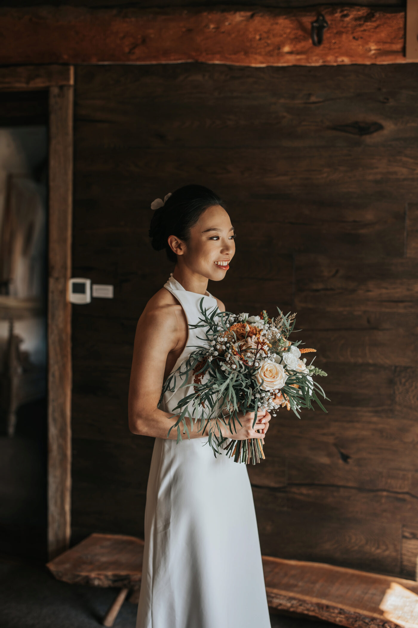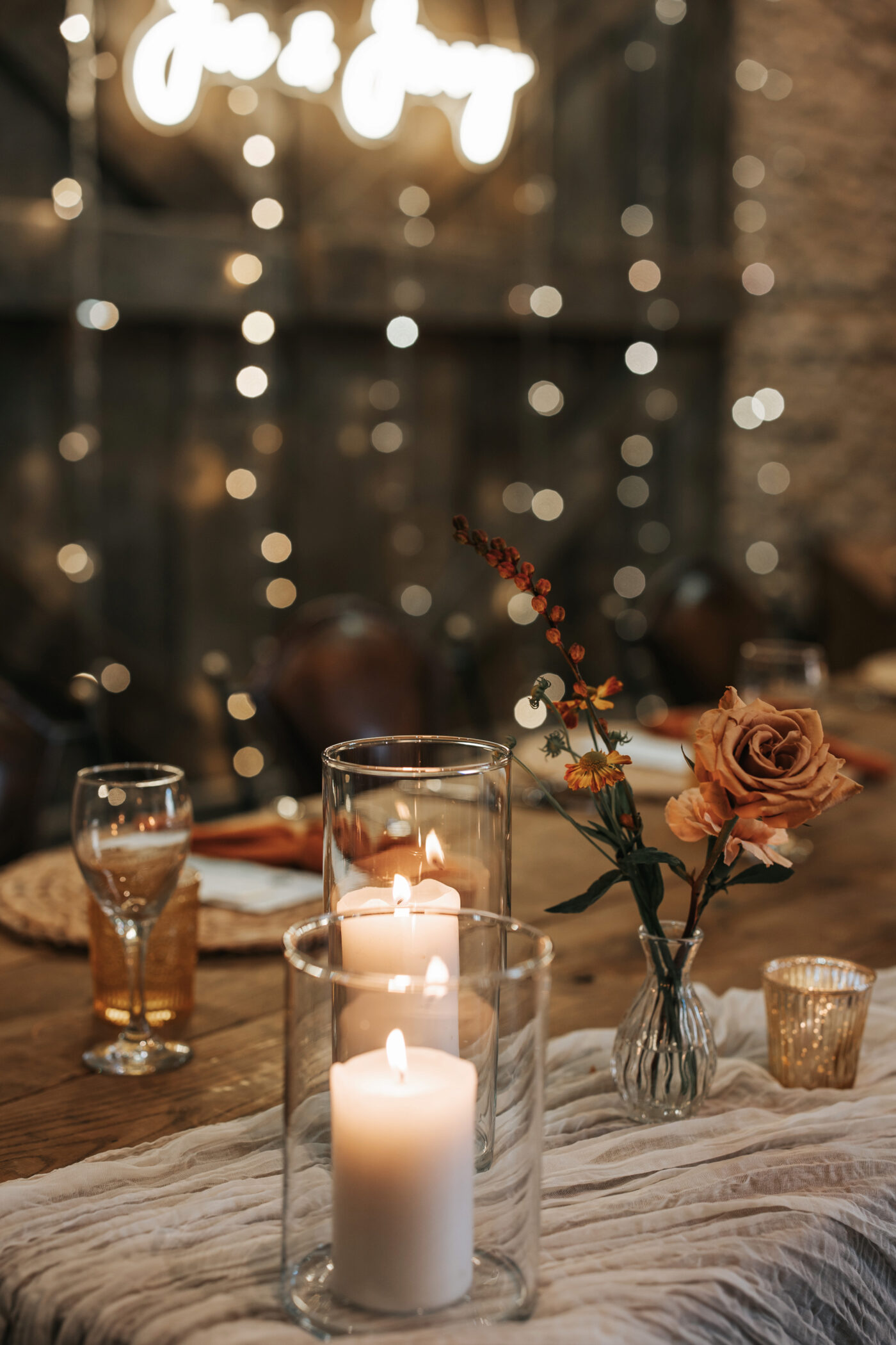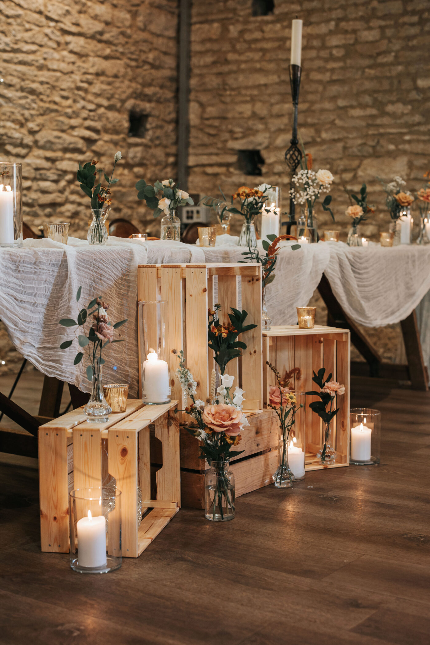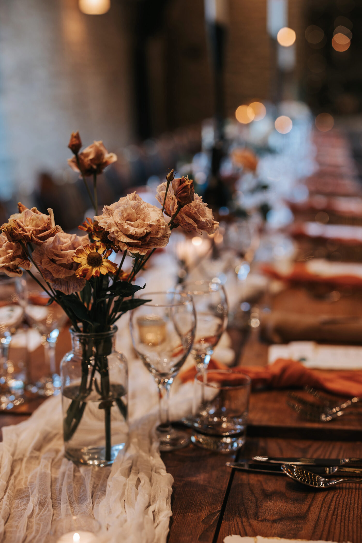 Floral arrangements combined fresh whites, muted greens, and rich terracotta accents, balancing wild beauty with intentional design. Every detail honored the venue's rustic charm while adding a modern, elegant touch.